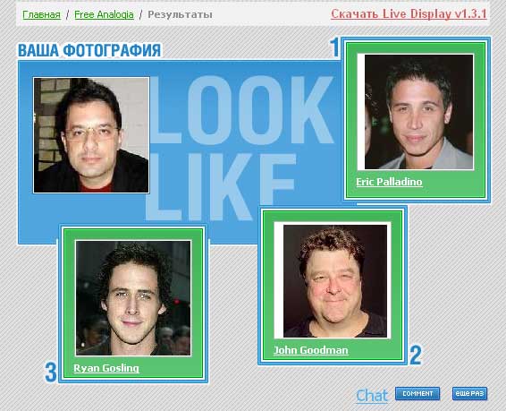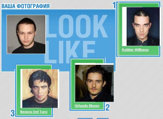 На главной странице сервиса представлены победители - те участники, которые добились самых лучших результатов сравнения со звездами. Вот один из победителей - убедитесь, насколько он похож на знаменитых актеров: