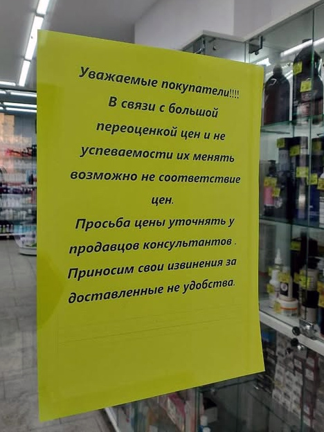 В этом объявлении, вздыхает Училка, прекрасно всё! И переоценка цен, и не успеваемость их менять, и не соответствие цен, и не удобства. О русский ЕГЭ, бессмысленный и беспощадный!
