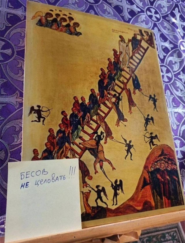 Глупенькая старушка, будучи в церкви, выменяла две свечки, одну поставила перед образом святого Михаила, а другую, не рассмотря, пред пораженным демоном. Дьячок, увидя, сказал ей:"Ах! Что ты делаешь, бабушка, ведь ты эту свечку перед диавола". Она на то: "Не замай, батюшка, не худо иметь везде друзей: в раю и в муке; мы еще не знаем где будем".