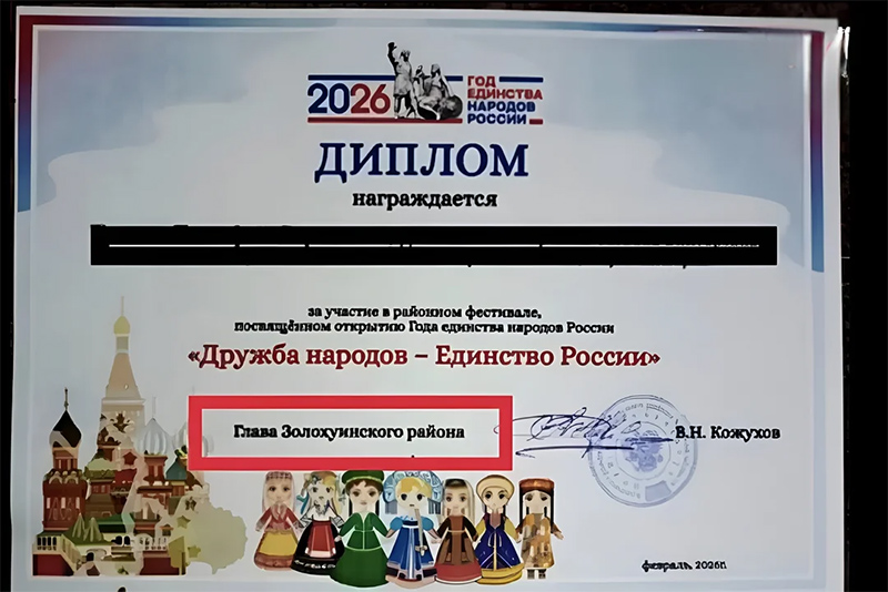 В Курской области участники фестиваля "Дружбы народов" получили дипломы от главы Золохуинского района Кожухова. Вообще-то район называется Золотухинским, но местные жители согласны с тем, что при Кожухове он стал Золохуинским.