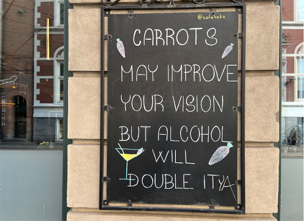 Татьяна прислала плакат, висящий на стене кафешки: "Морковка может улучшить ваше зрение, но алкоголь его удвоит!" Ну, в смысле, что в глазах будет двоиться. Хорошая реклама.