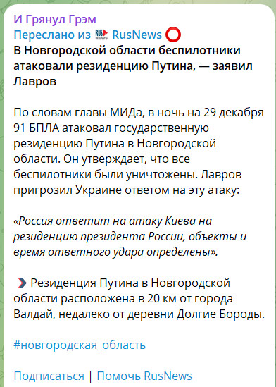 Ateo: резиденция Путина «Ужин», сообщили «Соте», что минувшей ночью не слышали работы ПВО, которая бы сбивала 91 беспилотник, о котором заявил глава МИДа РФ Сергей Лавров.