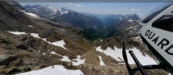 Если бы мне как инженеру поставили задачу сделать такое, то я бы установил штук надцать камер щелкающих все что есть по всей сфере примерно из одной точки. Обязательно бы их области обзора перекрывались бы. Потом программно можно вырезать все лишнее (кронштейн устройства крепления к вертолету, соседние камеры и т.п.)