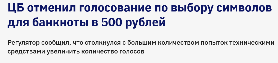 Центробанк решил провести голосование за символы для новой 500-рублевой купюры, посвященной Пятигорску и Северо-Кавказскому федеральному округу. Голосование проводилось на сайте, при этом разрешалось использовать аккаунты из российских соцсетей.