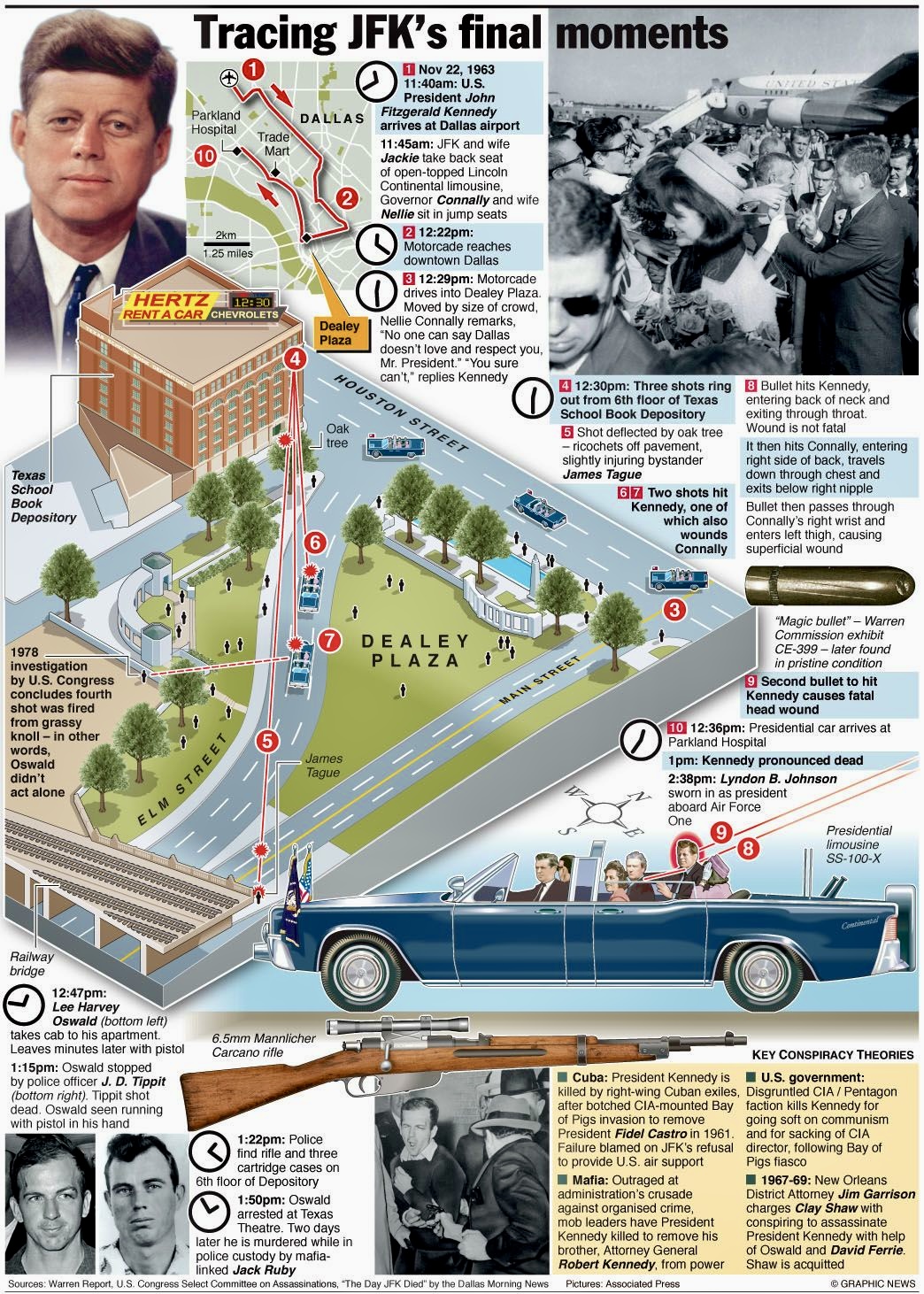 Посудите сами - посредственный стрелок с неудобной позиции (шестого этажа) сделал за 5 секунд из винтовки (которую надо было перезаряжать) три выстрела. Ими он попал в движущуюся цель, убил президента США, тяжело ранил своими "магическими пулями" губернатора Техаса, и т.д. При этом десятки свидетелей показали, что стрельба велась несколькими стрелками и спереди. Жена губернатора показала, что "стреляли совсем с другой стороны", но полиция сказала "это она выдумала из-за истерики".