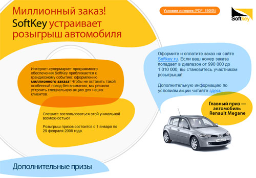 В интернет-магазине "Софткей", к которому я имею прямое отношение, ожидается юбилейный миллионный заказ. По этому поводу магазин устраивает праздничную лотерею: если номер заказа попадает в диапазон от 990000 до 1010000, то он участвует в лотерее со вполне реальными призами: ноутбуки, телефоны, плееры, турпоездки, ну и суперприз - автомобиль "Рено Меган". Ну и кроме того, победителям бесплатно достанутся коробочные версии всякого популярного ПО.
