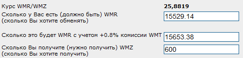В последних WM-киперах появилась удобная опция "Обменять", с помощью которой вы можете менять одни титульные единицы на другие прямо в кипере - легко и быстро. Однако делать это рекомендуется только в том случае, если нужно срочно обменять буквально несколько баксов или рублей. Потому что курс там совершенно кошмарный. Мне сегодня понадобилось обменять WMR (рубли) на 600 WMZ (доллары) и вот что мне выдали: