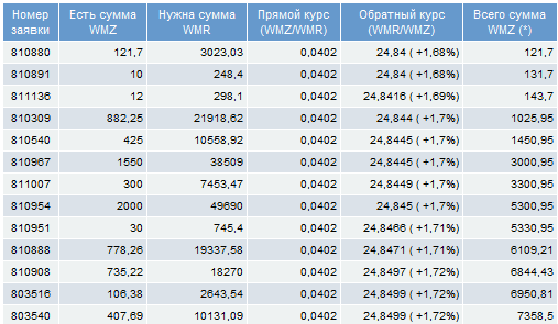 После этого я зашел на обычный обменник Exchanger. Посмотрел предлагаемые заявки по WMZ и немедленно купил нужную сумму по курсу примерно 24,8. Заплатил 14904. 600 рублей сэкономил - почти 25 баксов. На ровном месте.