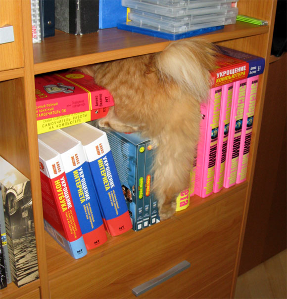 И если не знать, что там на учебниках в глубине лежит ее любимая махалочка, можно подумать, что кошка всерьез увлеклась изучением компьютеров и Интернета...