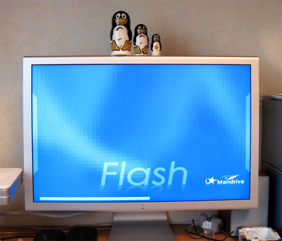 Кстати, Mandriva во флеш-варианте (загрузочный, предустановленный на двухгиговой флешке), подаренный Пашей Фроловым), у меня на рабочем компе так и не запустился. Виснет на каких-то драйверах (как на фотографии) - и с концами. Точно такая же ситуация была со всеми загрузочными и установочными вариантами Linux на моей прошлой рабочей тачке и нынешней. Не любит ее Линукс.