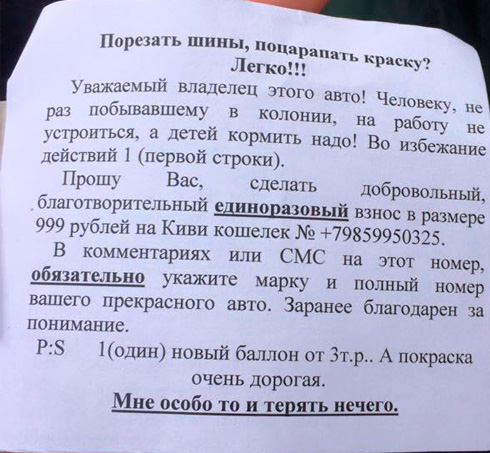 Вот вы что будете делать, получив такое? У меня к подобным вещам отношение простое: никаких денег вымогателям - ни под каким видом. Если бы этого принципа придерживались все - подобные автомобильные вымогательства быстро бы сошли на нет. Но так как всегда находятся уроды, которые предпочитают подмахнуть вымогателям, одновременно подкладывая жирную свинью другим автовладельцам, снятие номеров, шантаж подобного рода - все это происходит и будет происходить.