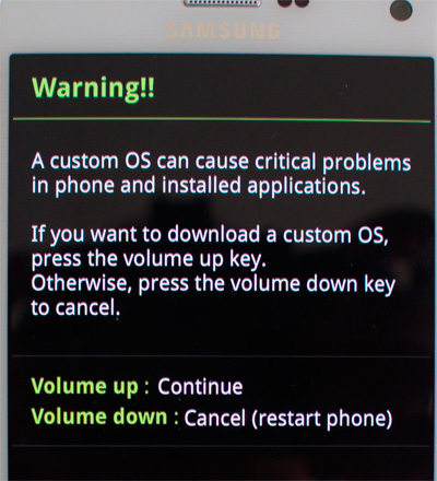 Далее смартфон надо ввести в режим загрузки. Для этого его нужно полностью выключить, а затем включить, держа одновременно "Громкость вниз - кнопка Домой - Питание". Как только на экране появится какая-то информация, кнопку нужно отпустить.