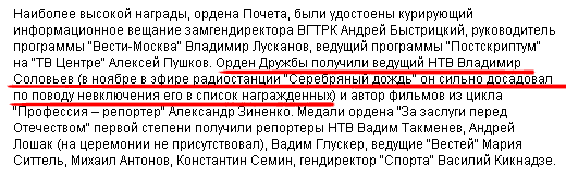 Ура, ура, наконец-то наш с Плющевым любимый Владимир Рудольфович Соловьев был удостоен важного правительственного ордена - Орден Дружбы C Нужными Людьми! Поздравляем со страшной силой!