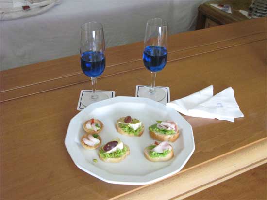 В отделении номеров-суитов Amathus отеля каждый день приносят так называемое шампанское с тапас (испанские бутербродики). "Шампанское" местное и паршивое, представляет собой нечто вроде растворенных в шипучке карамелек с добавлением легкого алкоголя. Поэтому мы всегда отказываемся от этой любезности. Однако отказаться толком невозможно - служащие обязаны доставить раствор карамелек в номер, поэтому врываются в запертую дверь, сносят меня, стоящего на пороге, и никакие отговорки не действуют.