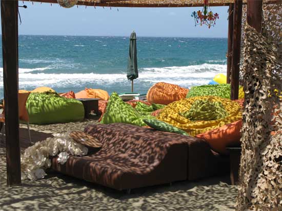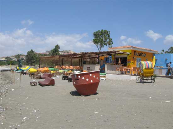 В Лимассоле сейчас стали популярны ночные транс-пати. Мы обнаружили как минимум пару заведений, рассчитанных именно на подобные развлечения. Вот одно из них - некое Guaba. Днем это все выглядит крайне непритязательно, а ночью зажигаются огни, факелы у моря, народ заполняет лежачки, пьет, курит (в том числе и нечто ядреное), слушает музыку и всячески веселится.