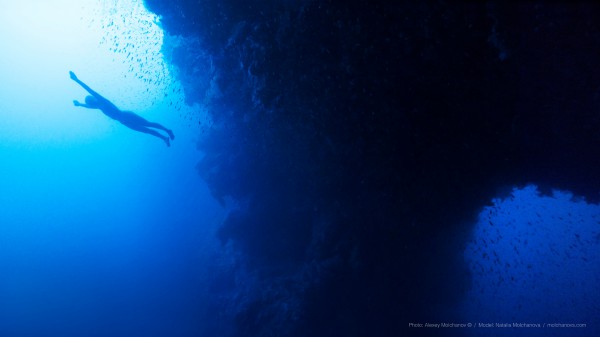Ее сделал Алексей Молчанов на глубине 60 метров. Он заснял, как Наталья Молчанова в свой день рождения проныривает арку Блю Хола на задержке дыхания.
