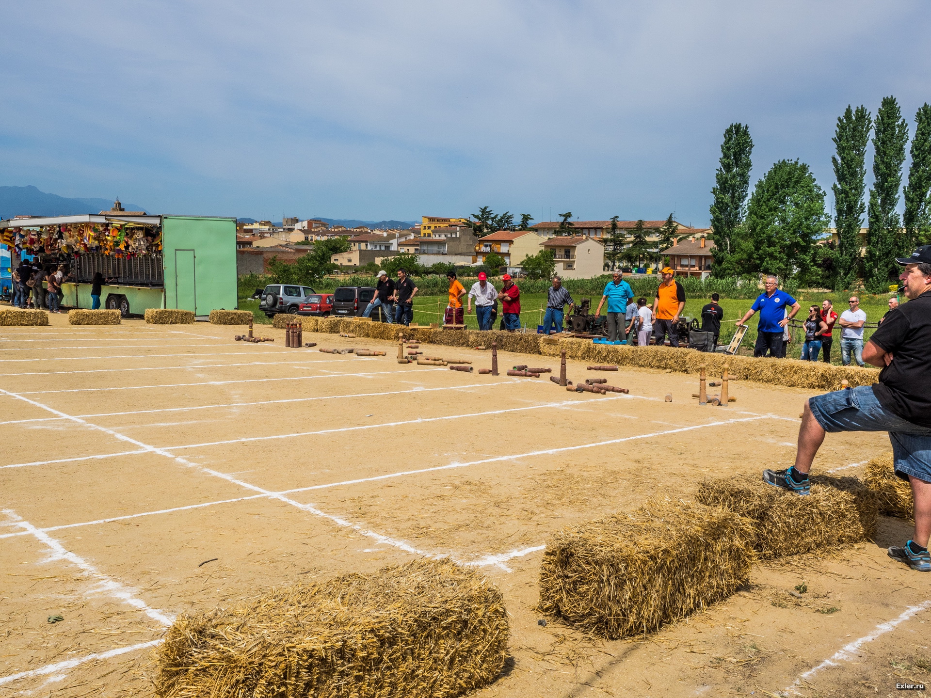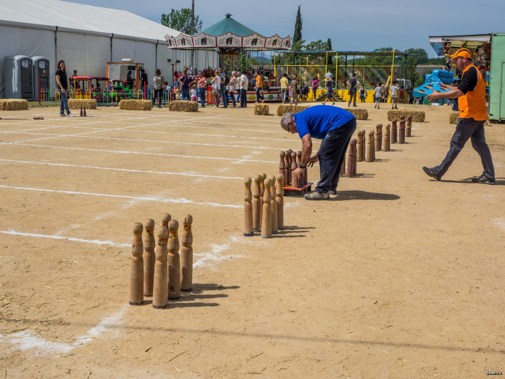 Посетители развлекают себя игрой, похожей на городки. Вокруг скопилось немало зрителей и каждый удачный бросок встречается бурными криками одобрения.