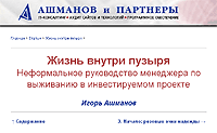 На сайте "Ашманов и партнеры" опубликована книга Игоря Ашманова "Жизнь внутри пузыря. Неформальное руководство менеджера по выживанию в инвестируемом проекте". Почитать было весьма интересно и познавательно, хотя часть пикантных подробностей о нелегком жизненном пути "Рамблера" я знал и до этого. Книга написана достаточно жестко и откровенно, но в этом, собственно, вся суть, иначе зачем вообще писать подобное произведение. Понятно, что некоторые вещи Игорь освещает весьма субъективно, но это как раз прямо декларируется - субъективный взгляд человека, который довольно продолжительное время находился внутри проекта.