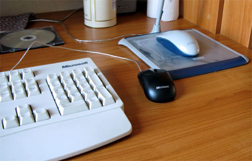 Купил маленькую мышку для ноутбука. Мышка майкрософтовская, но это в данном случае неважно - и Logitech выпускает совершенно аналогичные, и еще несколько фирм. Подключил мышку к ноутбуку, поработал. Удобно. Потом сел за большой комп, на котором мышка от Wacom Graphire (см. иллюстрацию), и вдруг стал ощущать какое-то заметное неудобство. Потом понял - мышка слишком большая! (А я эту мышку использую уже лет десять.) Поставил на большой комп маленькую мышку - класс! Так и оставил. Для ноутбука куплю еще одну - например, логитековскую, для разнообразия.