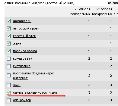 Вчерашняя статистика мест сайта Экслер.ру в выдаче по запросам в Яндексе.