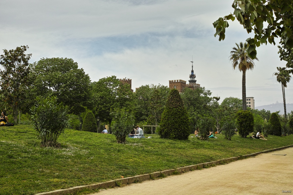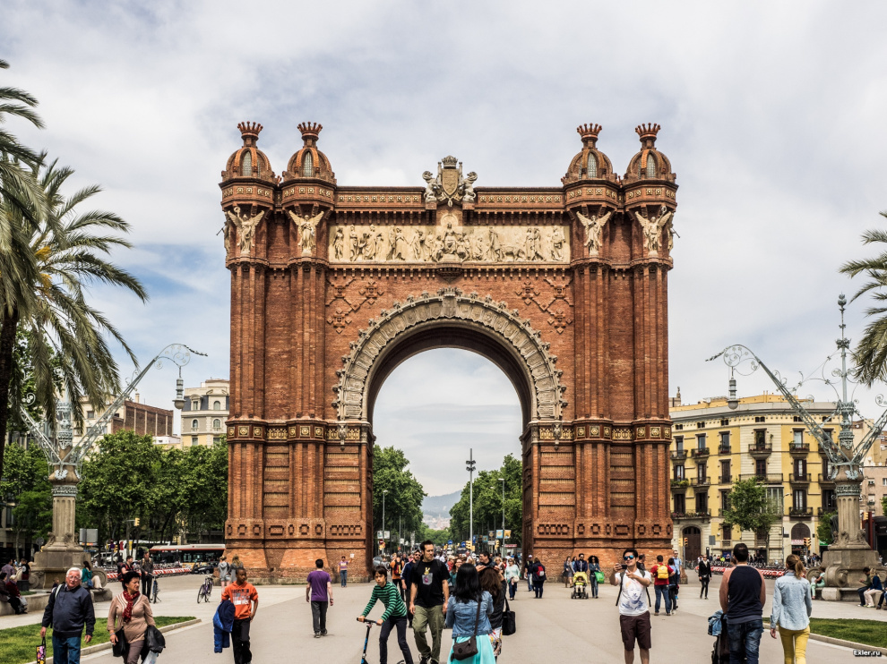 Место для парковки мы рядом не нашли (обычно можно встать на небольшой парковке Французского вокзала, но в этот день все было занято), поэтому мы поехали на парковку, которая находится под площадью у Триумфальной арки - она располагается недалеко от главного входа в Парк Цитадели. Арка, кстати, была возведена именно к той самой Всемирной выставке 1888 года. Вот так она выглядит сейчас на фоне многочисленных туристов.
