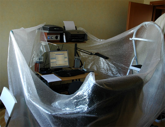На фронтах борьбы с эхом при записи радиопередач начался новый раунд. Я вспомнил, что у нас же есть чудесная пупырчатая пленка, и сегодня попытался изолировать рабочее место от эха с ее помощью. Получилась вот такая фигня...