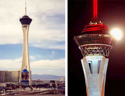 Но в "Стратосфере" есть еще более забавный аттракцион. Видите на фото шпиль над расширением башни? По этому шпилю вверх вас выстреливают в специальном кресле по желобу. Обратно летите в свободном падении и тормозите уже перед самым спуском. Плюс - во время спуска делают фотографии, и это главная часть шоу - рожи там получаются совершенно демонические. Вот там полетать я не рискнул.