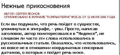 Статья Сергея Леонова (главного редактора) в "Компьютерре" от 12 июля. Статья называется "Нежные прикосновения". Она посвящена сенсорным дисплеям. У статьи эпиграф: