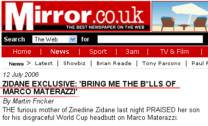 Ну вот и выяснилось, что именно Матерацци сказал Зидану. Как и ожидалось, сказал гадость о его матери, которая, между прочим, находится в больнице в тяжелом состоянии. Неудивительно, что Зидан все-таки не сдержался.Оно понятно, что он не должен был так поступать, что он подвел команду, испортил себе уход и так далее. Однако Зидан даже со своей красной карточкой и разочарованием миллионов болельщиков останется великим футболистом и настоящим мужиком, а этот Матерацци даже с чемпионским титулом останется просто подлой мразью. Такое у меня личное мнение.