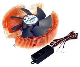 Медный, на шарикоподшипниках, реально тихий и мощный плюс - с собственным регулятором вращения (хотя можно регулировать и программно, если мать позволяет). Поставил - не нарадуюсь. Температура процессора на самых низких оборотах (1200) - 42 градуса. Кулер работает тише, чем внутренние корпусные пропеллеры. В общем, сказка и песня. Да и регулятор отдельный убрал - он уже не нужен.