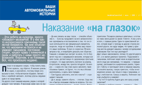 Нет, я конечно понимаю, что "Сочинские гаишники" - мегарекордсмен по совершенно беспардонному воровству, но чтобы в московском глянцевом печатном издании в 2006 году его опубликовали даже без намека на имя автора - это было сложно представить. Ладно еще в каких-нибудь 98-99 редакторы считали Интернет очень удобным складом никому не принадлежащих материалов, которые можно нагло переть сколько угодно. Но из них это убеждение потихоньку вышибли, и такие случаи уже давно не встречались. И вот на тебе - глянцевый журнал "АМГ Клуб" N1(5) 2006: мой слегка перекуроченный рассказ (изменили название и самое начало) вообще без имени автора...