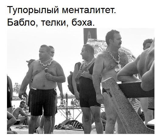 В FB бросили ссылку на статью в "Снобе" - "Тупорылый менталитет. Бабло, телки, бэха". Статья о том, что менталитет российских наворовавших сильно отличается от менталитета богатеев других стран. А мы-то, дураки, и не знали. Но самый прикол заключается в том, что эту статью венчает уже сто лет как гуляющая по Интернету фотография греческих цыган на отдыхе. Умеют подбирать иллюстрации, что уж там...