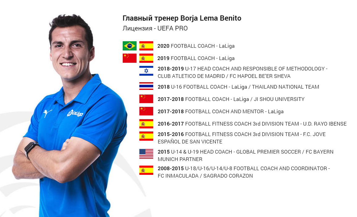 Главный тренер — испанец Борха Лема Бенито. Профессионал с огромным опытом в тренировке иностранных футбольных клубов, молодежных команд и работе с детьми