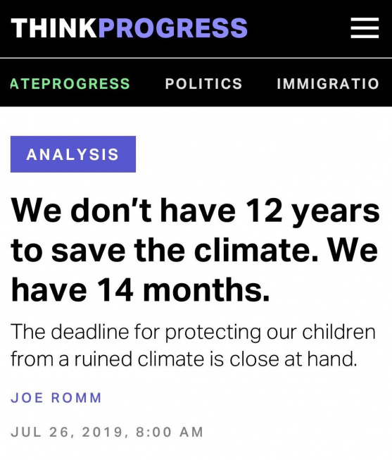 Пик “зелёного мании” пришёлся на весну-лето 2019 года. ThinkProgress тогда обещала, что миру осталось 14 месяцев до наступления точки невозврата. А BBC давало 18 месяцев до начала “необратимых изменений” земного климата.