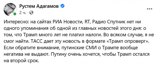 А теперь смотрите, как у Рустема это интерпретировалось. Главная новость дня! Сенсация! Трамп много лет не платил налоги! Ну просто ваще - ни рубля! А на сайтах РИП Новости, RT и так далее об этом шокирующем факте нет ни одного упоминания. Покрывают мерзавца Трампа, явно покрывают! А вот если бы о Байдене такое написали, небось сразу бы подняли вой!