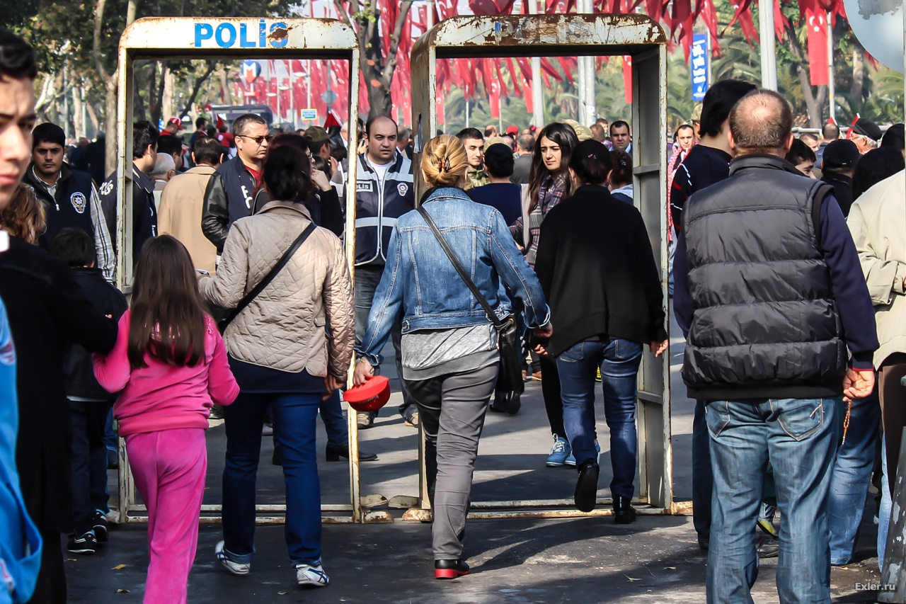 Ближе к площади, откуда начинался парад (это где-то в километре от точки, где мы были) стояли ограничительные рамки потрепанного вида и полиция проверяла всех металлоискателем и осматривала сумки.