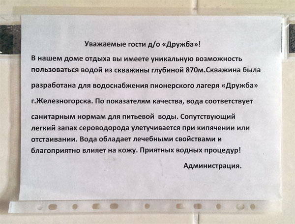В доме отдыха, где мы живем под Железногорском, интересная ситуация с водой. Вода попахивает сероводородом (то есть тухлыми яйцами) и дико щелочная: такое ощущение, что пьешь мыльный раствор, если вдруг возникнет странная мысль эту воду пить. Но администрация дома отдыха оптимистично смотрит на вещи и заявляет, что мы, дескать, имеем уникальную возможноть. Ага, ага...