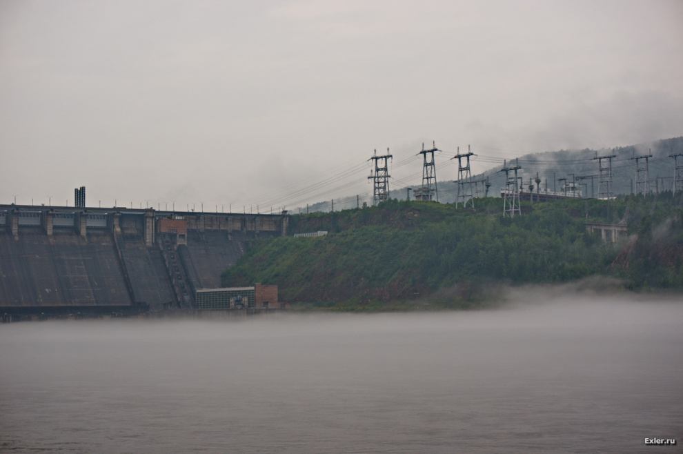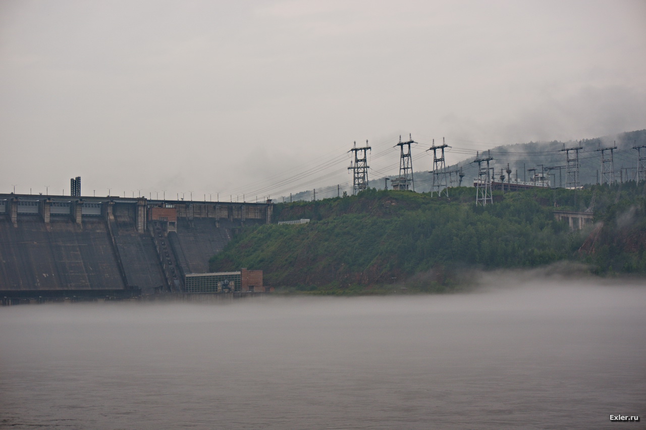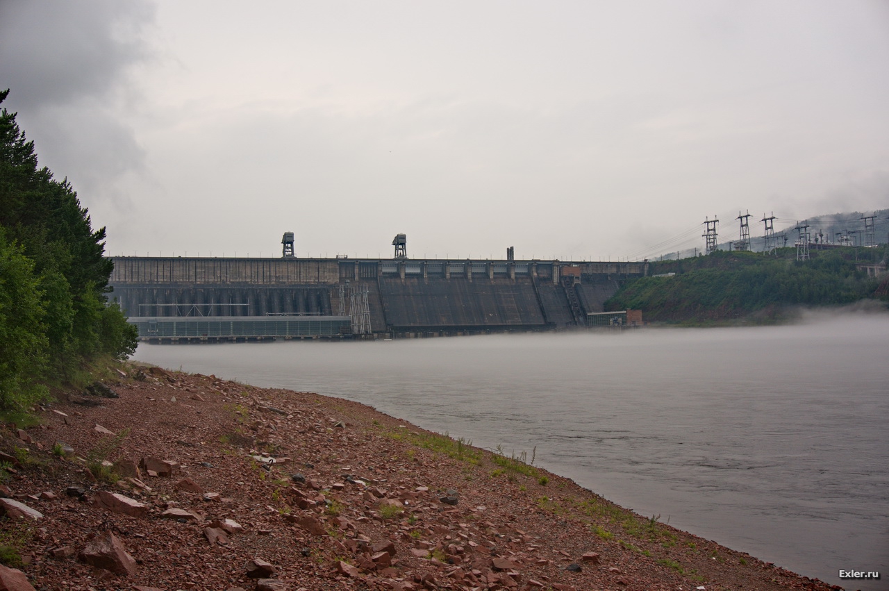 К сожалению, с погодой не повезло конкретно: лупил дождь, стелился туман. У моста и на мосту напротив ГЭС останавливаться нельзя категорически, и мы совершенно случайно обнаружили точку на берегу, откуда можно было сфотографировать и ГЭС, и мост напротив. Вот она, Красноярская ГЭС.