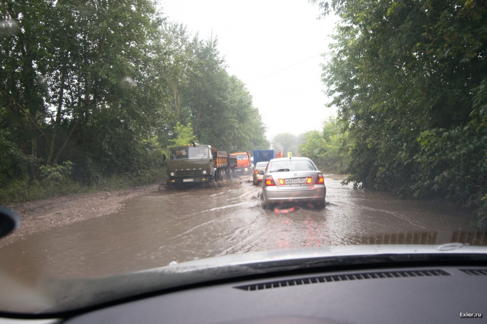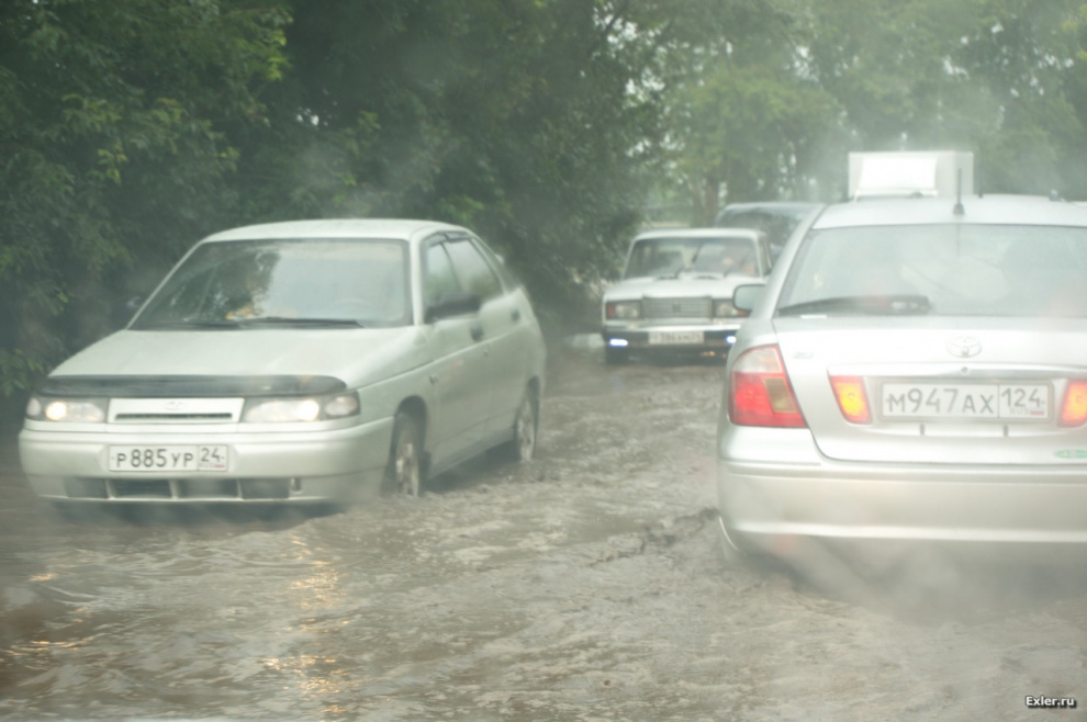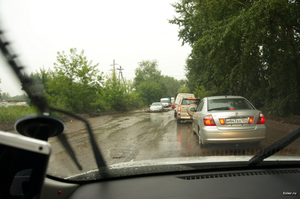 Ну и как раз вчера отправился я посмотреть Красноярскую ГЭС. Уже на подъезде к Красноярску я понял, о чем говорили местные: дороги там были аховые. Плюс еще лупил непрерывный дождь (по прогнозу была переменная облачность и местами осадки), ну и когда я въехал в сам Красноярск, то аж заколдобился: дороги совершенно отвратительные, вода никуда не сливается и после неппродолжительного дождя на дорогах воды - по самые автомобильные помидоры. А если еще прибавить туда небольшие выбоины в асфальте, которые весьма заметны даже для Камазов, вы представляете, во что превращается поездка по таким дорожкам. В общем, экспириенс был незабываемый. Ну и плюс - соответствующие пробки. Мы несколько километров по Красноярску ехали больше часа.