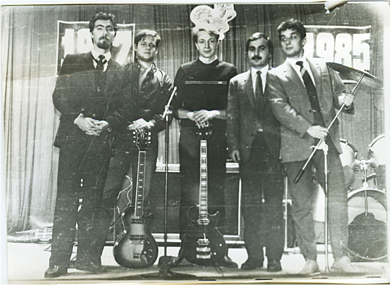 Когда был Экслер маленький и играл в ансамбле... Это группа из Тимирязевской академии, назывались мы "Комната номер 13" (у нас репетиционная в общаге была в комнате номер 13). Я - справа, держусь за стойку с тарелкой. У меня тогда был странный период - я все время ходил в костюме.
