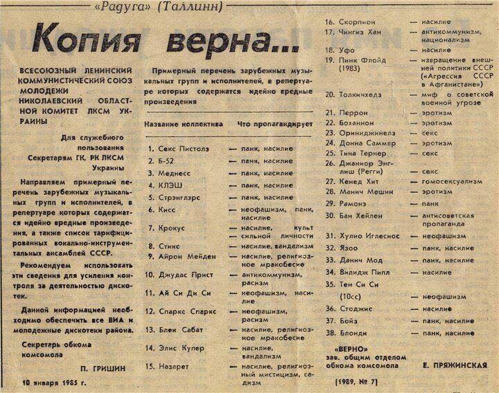 Помню-помню я эту бумажку. Несмотря на ДСП, ее тогда слили, и она в СМИ попала первый раз что-то там году в 1987, насколько я помню. Все тогда еще ржали над тем, как сладкоголосого Хулио Иглесиаса (Иглесиос - это уже что-то греческое получилось) эти пряжинские комсомолки ухитрились в неофашисты записать - вот уж совсем тетки были ку-ку. Ну а "Кисс" в неофашисты, ясный пень, записали за написание названия группы, что очевидно.