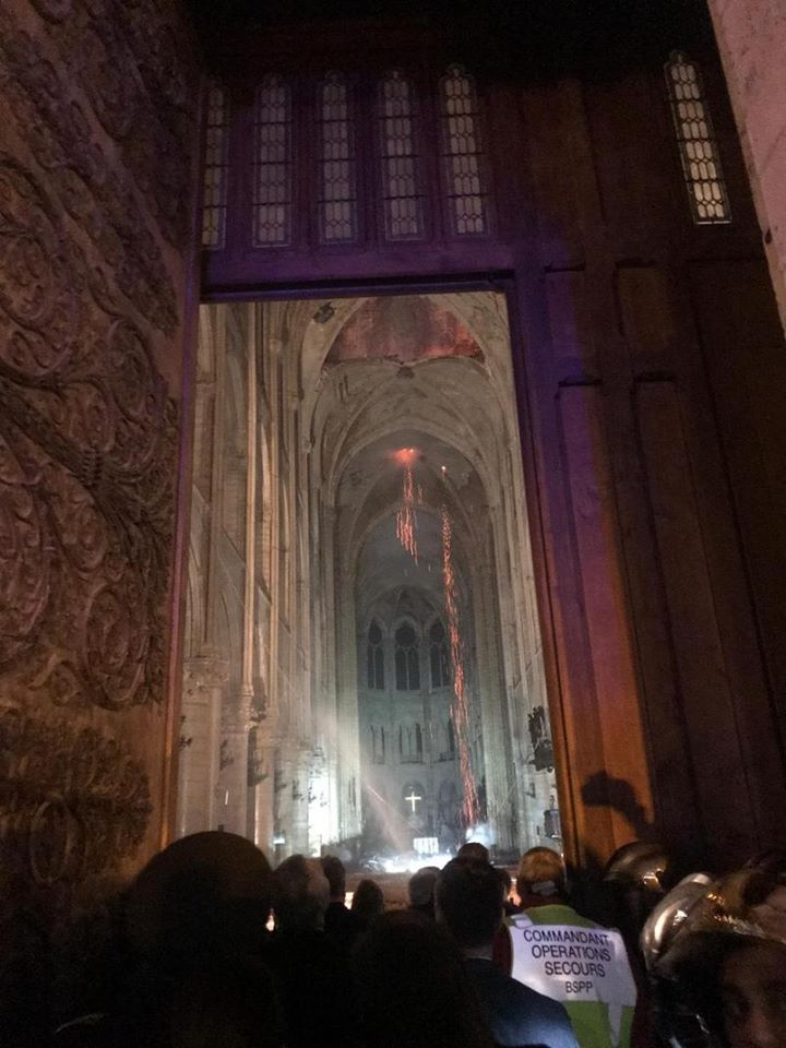 президент Франции, официальные люди и пресса буквально врываются в центральный неф собора, несмотря на то, что сверху в дыру, где стоял шпиль, еще сыпятся пылающие угли. внутри темно и спокойно. на стенах даже нет видимой копоти. интерьер не тронут. каменная коробка, увенчанная сложными готическими сводами - тоже из камня - защитила внутренность собора от пылающего над ней деревянного леса крыши.