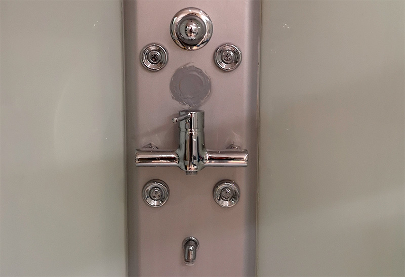 Дон Симон, как Чип и Дейл, тут же поспешил на помощь и привез две заглушки - чтобы в ванной хоть воду можно было включить. Мы стали отодвигать кабинку, пытаясь добраться до шлангов, на которые нужно было поставить заглушки.