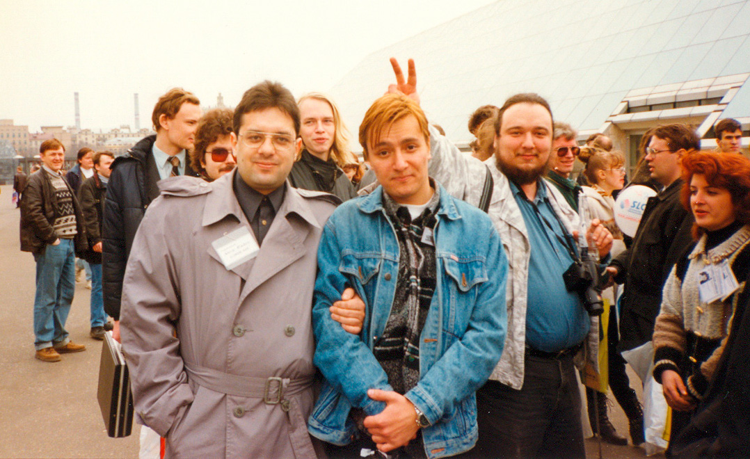 "Комтек" для нас был знаковой выставкой. На "Комтеке" собирались фидошники. У меня даже комплект фотографий сохранился. Это мы с Олегом Бочаровым. Сзади дуркует Феда Устинов. Справа - Надя Яцык.