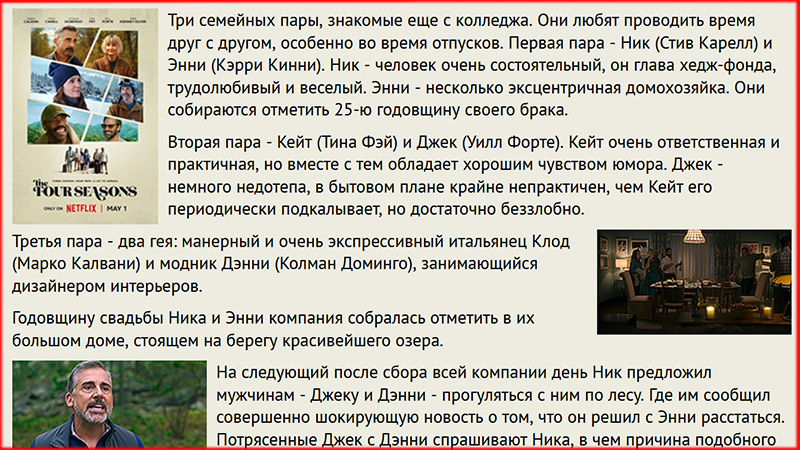 Три семейных пары, знакомые еще с колледжа. Они любят проводить время друг с другом, особенно во время отпусков. Первая пара - Ник (Стив Карелл) и Энни (Кэрри Кинни). Ник - человек очень состоятельный, он глава хедж-фонда, трудолюбивый и веселый. Энни - несколько эксцентричная домохозяйка. Они собираются отметить 25-ю годовщину своего брака. Вторая пара - Кейт (Тина Фэй) и Джек (Уилл Форте). Кейт очень ответственная и практичная, но вместе с тем обладает хорошим чувством юмора. Джек - немного недотепа, в бытовом плане крайне непрактичен, чем Кейт его периодически подкалывает, но достаточно беззлобно.