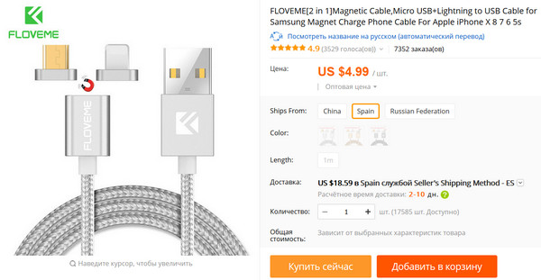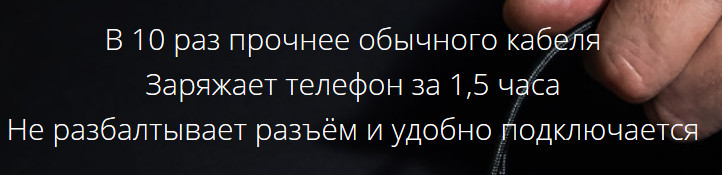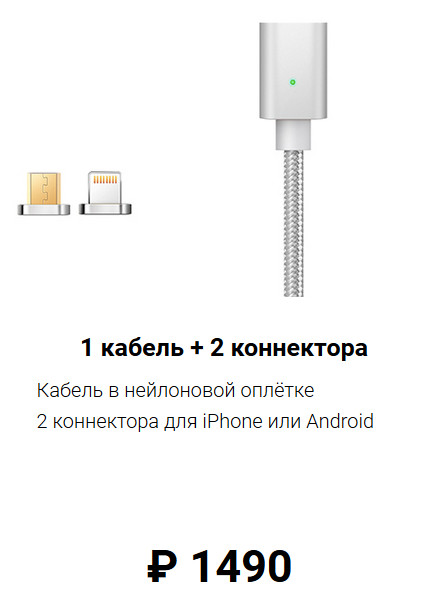 В российском Интернете сейчас активно рекламируется кабелек с парой магнитных головок - на microUSB и Lighting. Набор, замечу, странноватый, логичнее было бы продавать microUSB и Type-С. А Lighting - отдельно. Но не суть. У них там целый внушительный сайт, на котором обещается следующее.