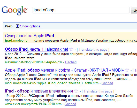 На Google мой обзор iPad поднялся до третьего места. Однако на "Яндексе" на пятом месте почему-то присутствует ссылка на pda-версию обзора, на которую заходит на несколько порядков меньше народу, чем на основной сайт. Ссылки на нормальную версию там нет вообще - по крайней мере, на нескольких первых страницах. Ни фига себе релевантность...