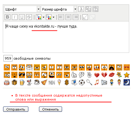 Как рассказал Just_whatever, на сайте "Одноклассники.ру" осуществляется цензура. Причем в личных сообщениях. Нет, слово "хюй" и прочие неэтичные выражения вы можете писать сколько угодно. Но стоит вам написать мерзкое слово vkontakte (название их конкурентов) - вас просто пошлют и не дадут отправить текст с этим недопустимым названием. Я проверил - все так и есть.