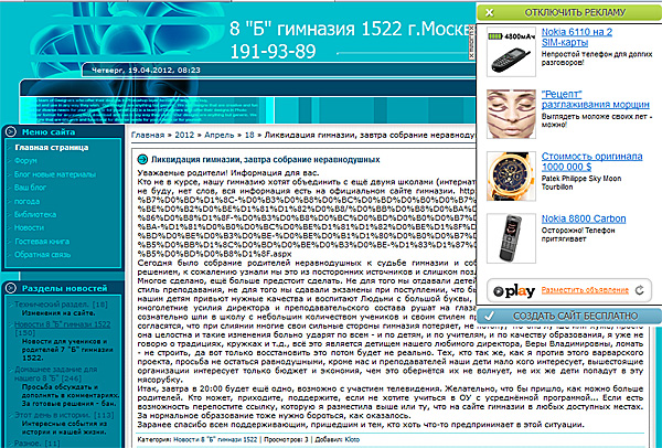 Ну, думаю, бесплатный хостинг (у гимназии видать нет $5 в месяц, чтобы это барахло по экрану не летало - бывает), ладно, нажму на "отключить рекламу", не развалюсь. Нажимаю. И получаю вот такое прелестное заявление.