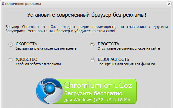 Отличная идея, правда? Хотите отключить рекламу - поставьте браузер Chromium от uCoz, который наверняка рекламой набит под самую завязку при таком подходе. Ну и да, разбежались - вот сейчас я все брошу и буду менять свой браузер на какие-то мутные версии от хрен знает кого.